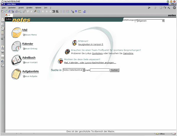 WINEPREFIX=$NOTESDIR/config wine $NOTESDIR/virtualWindows/Lotus/Notes/notes.exeAls Ergebnis bekommt man nach erfolgreichem Login dann die Startseite von Notes: